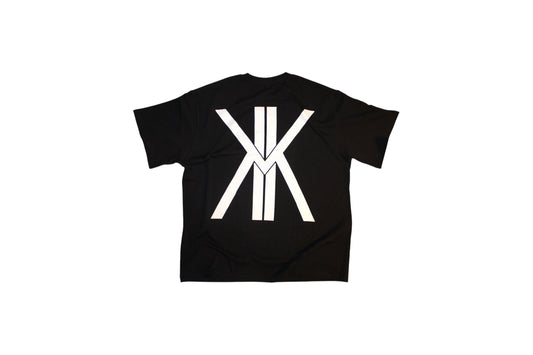 Black T-shirt, with black lettering and white logo